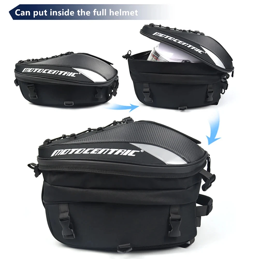 - Multi-Functionality: Use it as a rear seat bag, tail bag, helmet bag, or a convenient rider backpack.