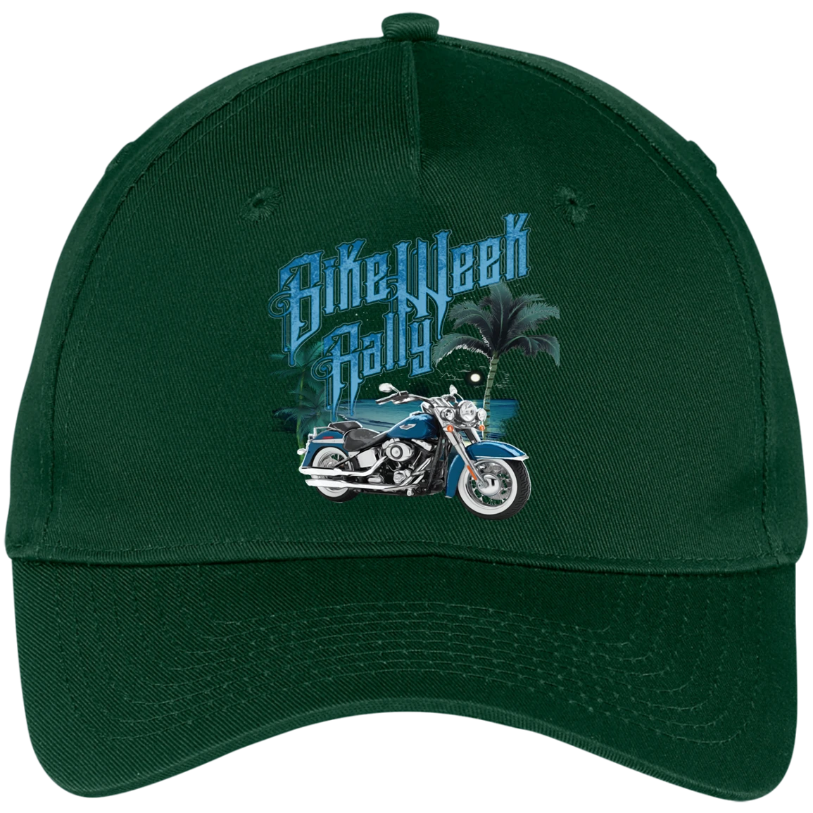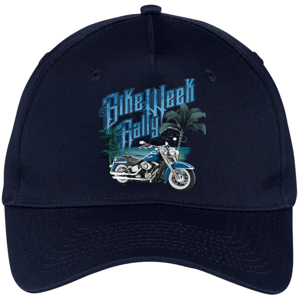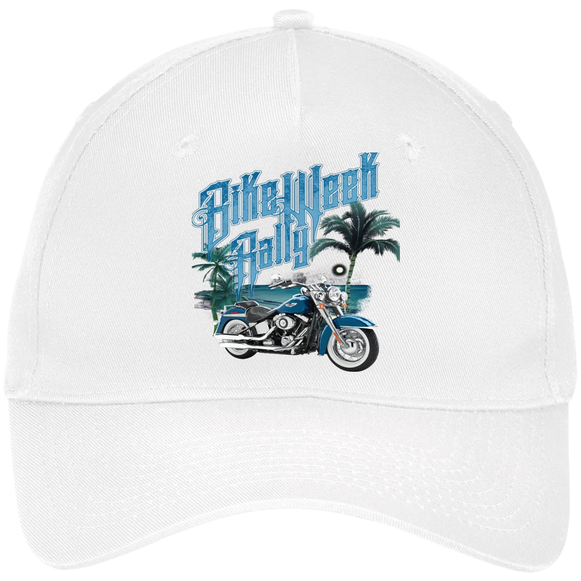 Send a visual message with this stunning yet simplistic Bike-Week Rally cap offered in a variety of color options including white, Black, Hunter and Navy. This cap is not only stylish, but also a bold statement among your peers.