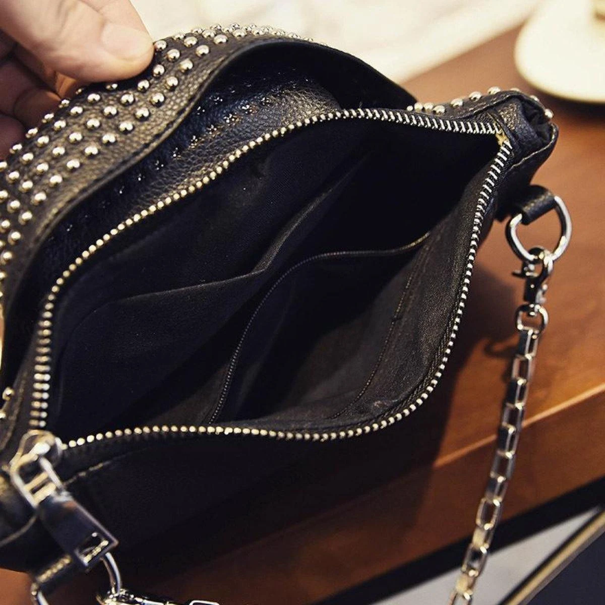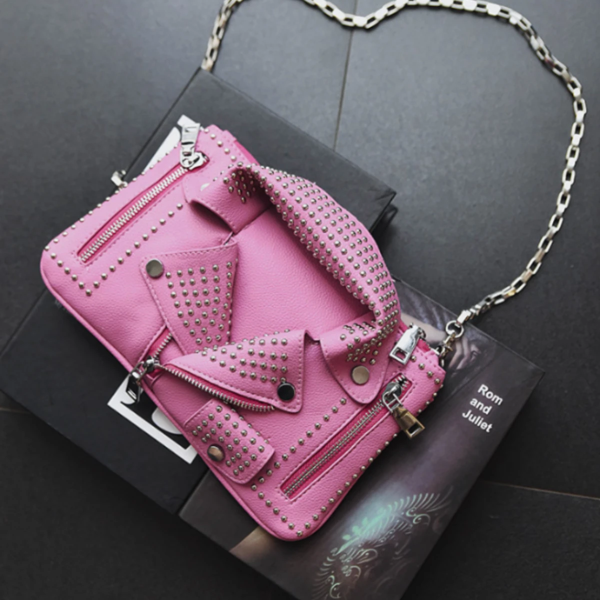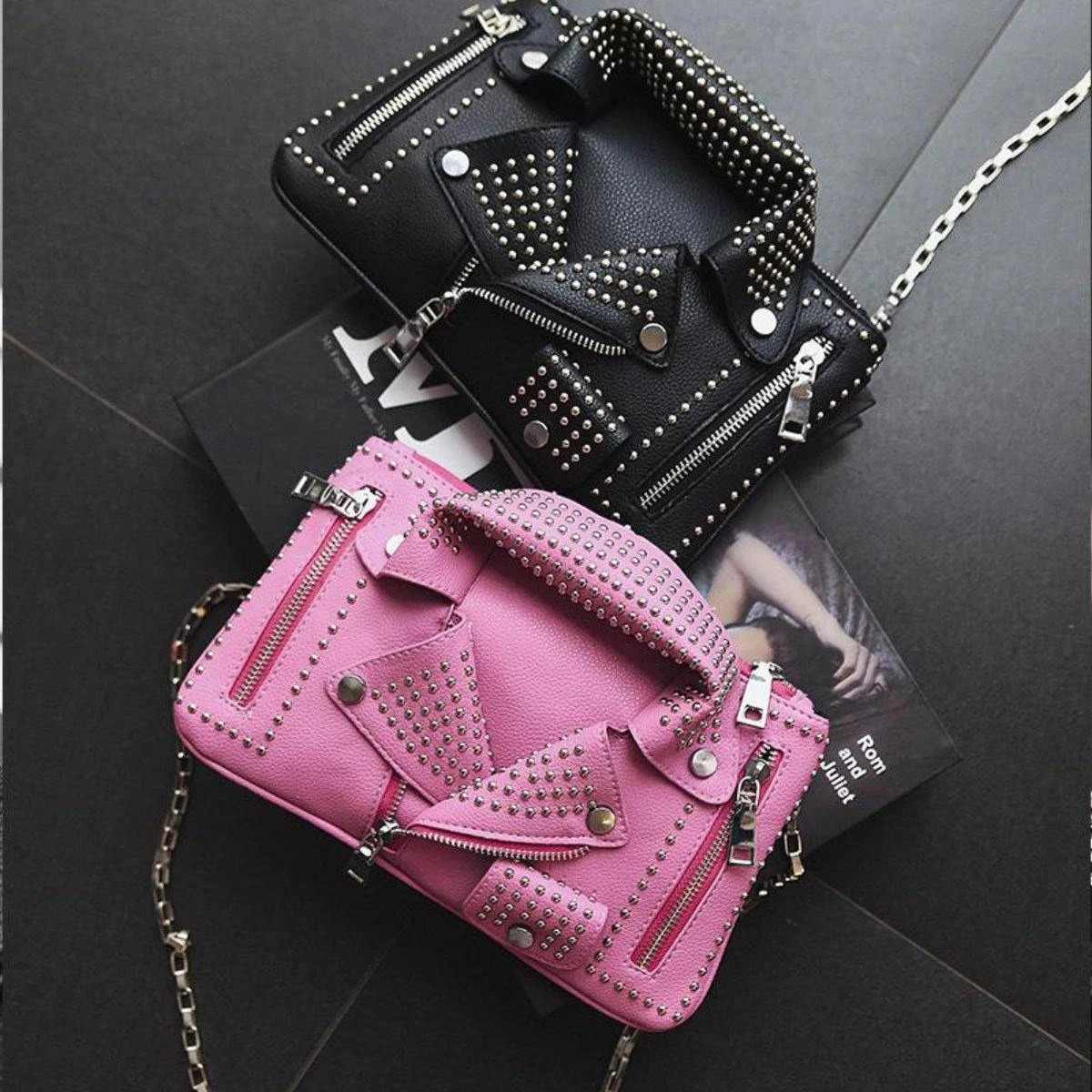 Made of high-quality PU leather and polyester lining, this Classy Jacket Shoulder Bag is shaped like a motorcycle jacket and embellished with rivets for a modern, rocker look. With one zipper pocket on each side, the main compartment, and two pockets on the inside, this cross-body bag is pretty roomy for your wallet, smartphone, keys, make-up, and other small items you like to carry with you. It also has a detachable chain strap, so you can easily adjust it as a shoulder bag or a clutch, depending on the occasion.