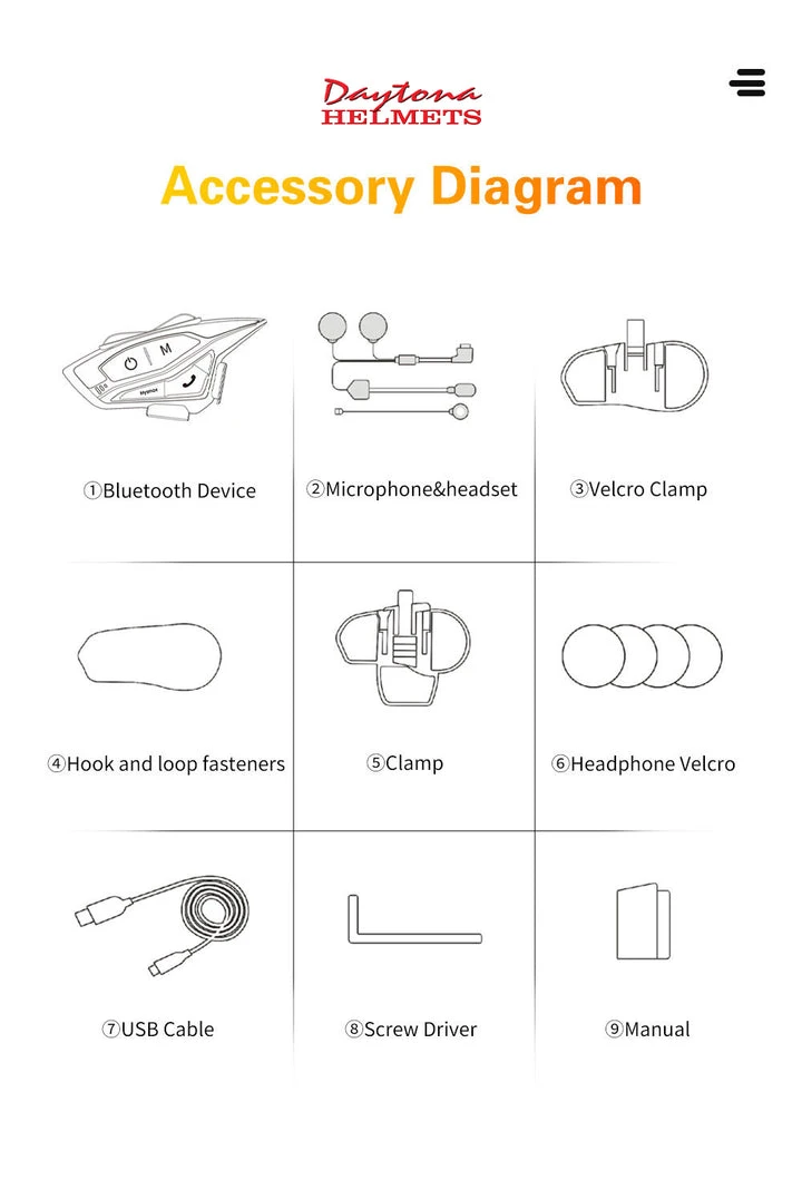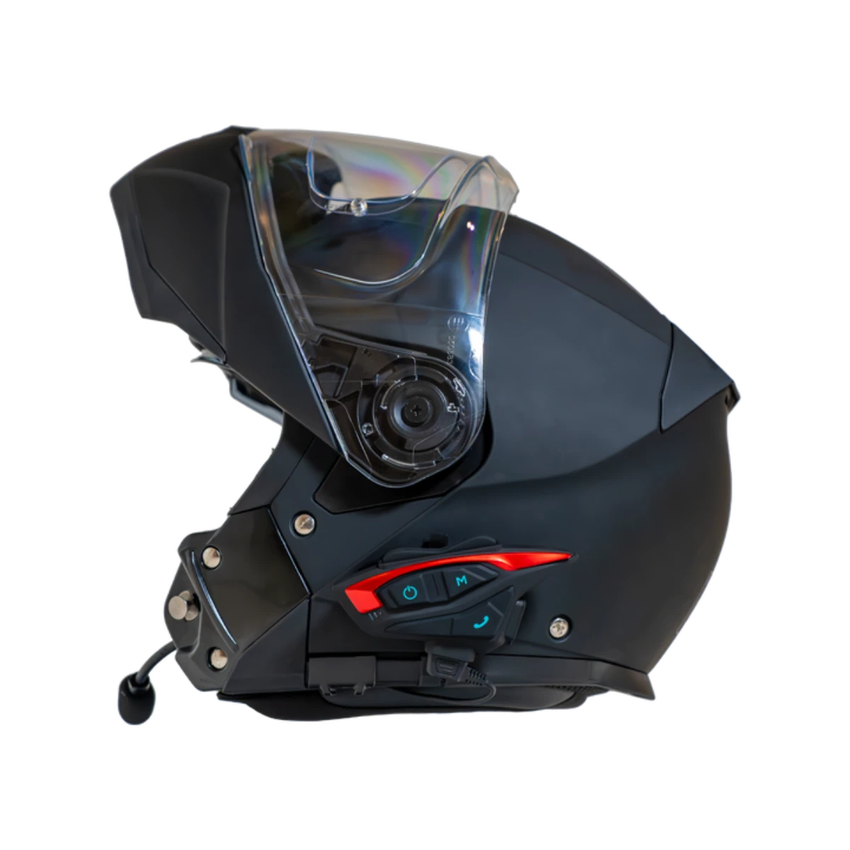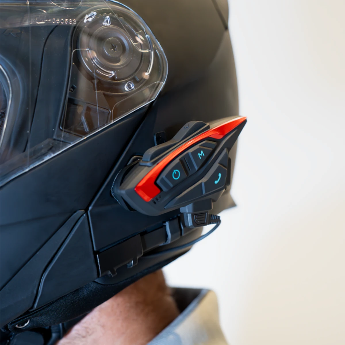 Our Bluetooth device is a universal Bluetooth system designed to work with all full-face or open-face helmet models. It can pair with intercoms from other brands, has a range of 1.2 miles (2km), and can connect with up to 8 people. Additionally, it can be paired with any Bluetooth-enabled device. The average usage time is 28 hours for intercom communication and 33 hours for playing music. Moreover, the accent piece on the device can be exchanged for different colors, such as red, green, or grey.