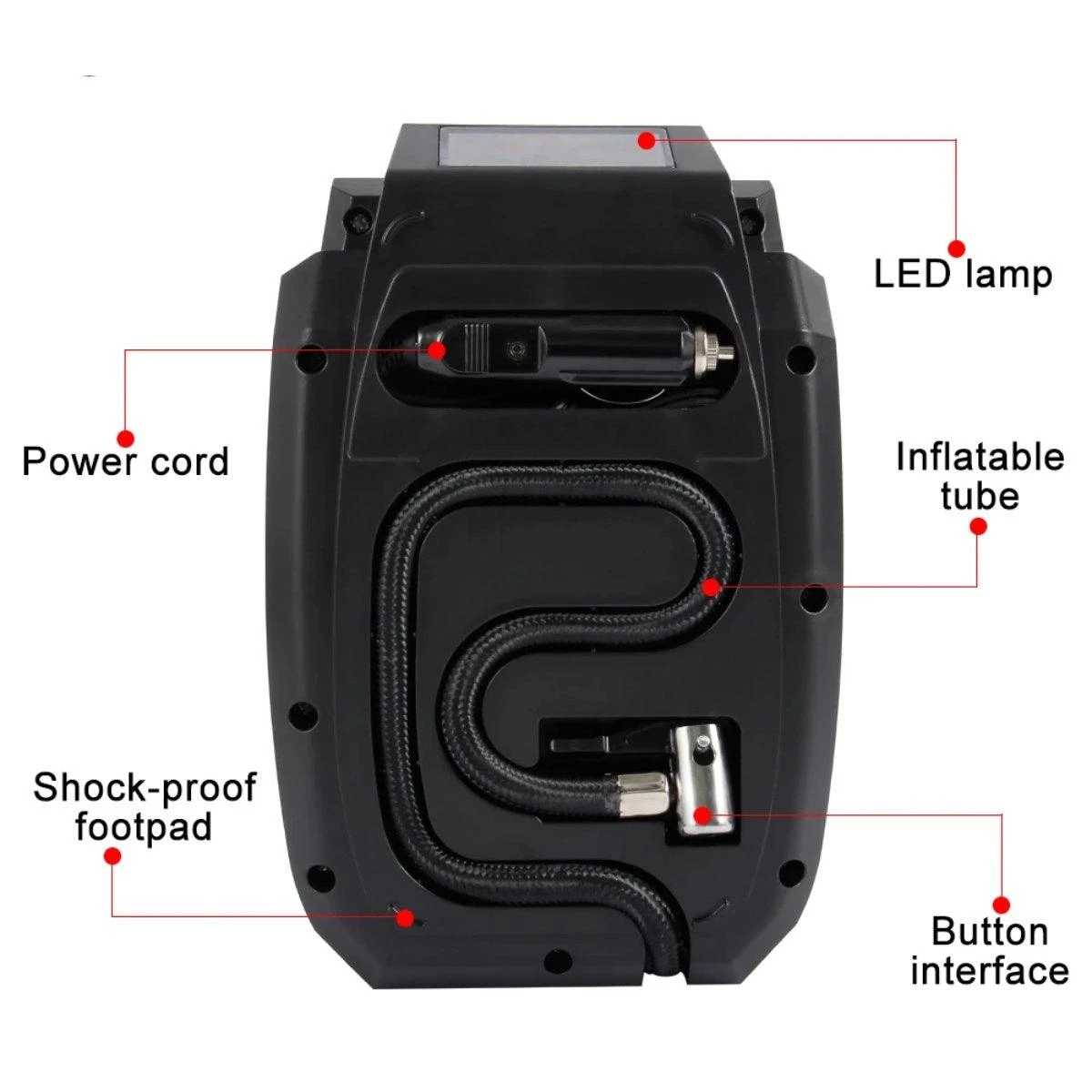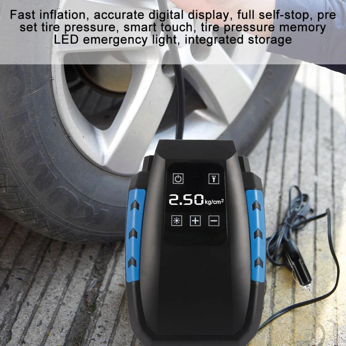 - Features: Fast inflation, accurate digital display, full self-stop, preset tire pressure, smart touch, tire pressure memory, LED emergency light, integrated storage.