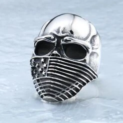 Stainless Steel Men’s American Flag Skull Ring, Silver Color