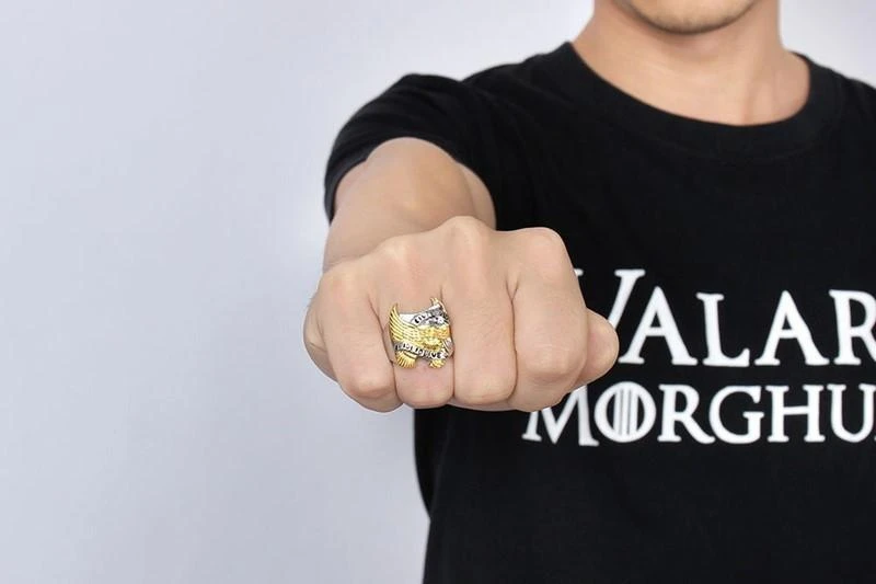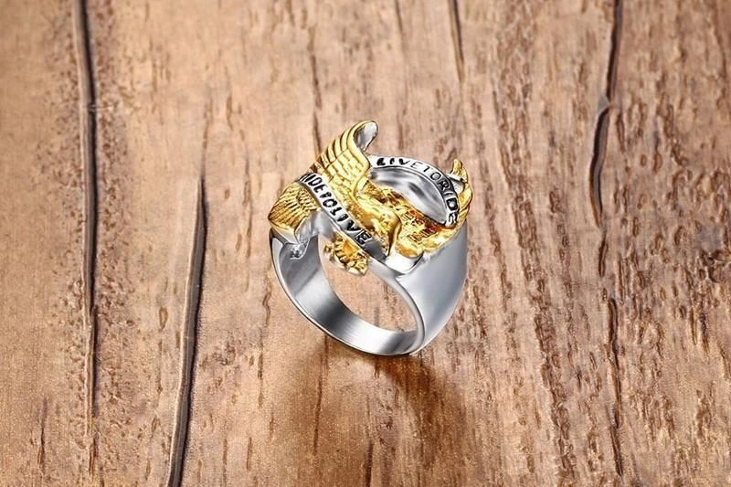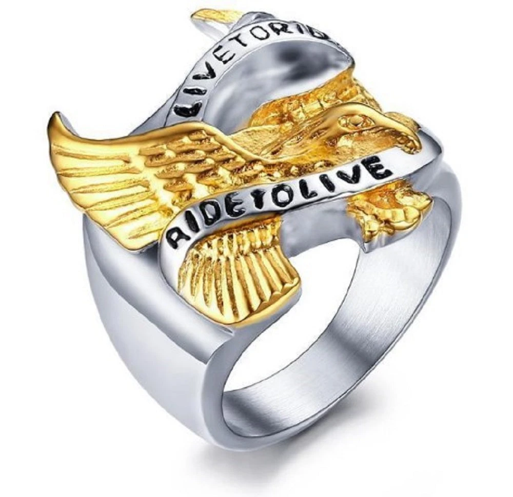 Made from 316L stainless steel, it’s resistant to rust, oxidation, and discoloration, which makes this corrosion-resistant alloy ideal for crafting long-lasting jewelry. The ring is decorated with a gold plated eagle circled by a silver-colored banner with a blackened inscription: ‘Live to Ride, Ride to Live,’ making this piece a true biker ring.