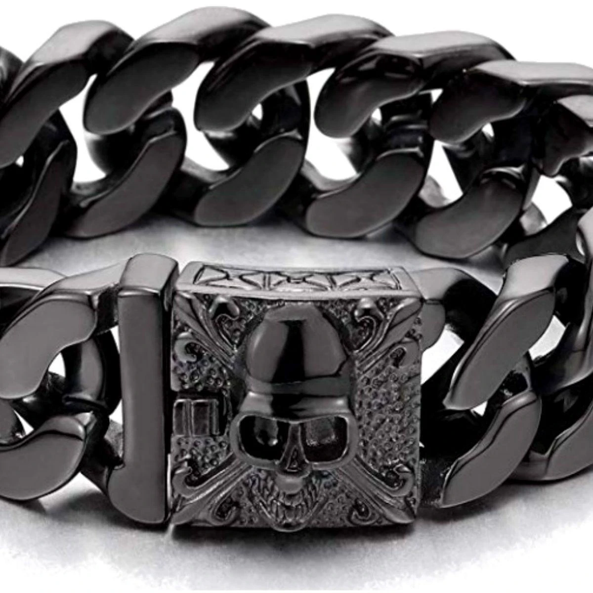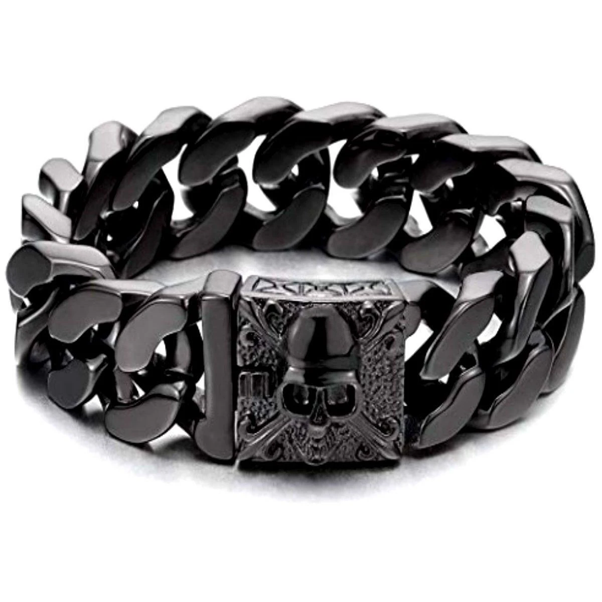 This epic skull biker bracelet is a solid piece of jewelry that feels comfortable in your hand. You are going to appreciate the craftsmanship and attention to detail that has gone into creating this polished skull masterpiece. The wicked-looking polished skull piece is the center of attraction that blends with the stainless steel chain and genuine leather.