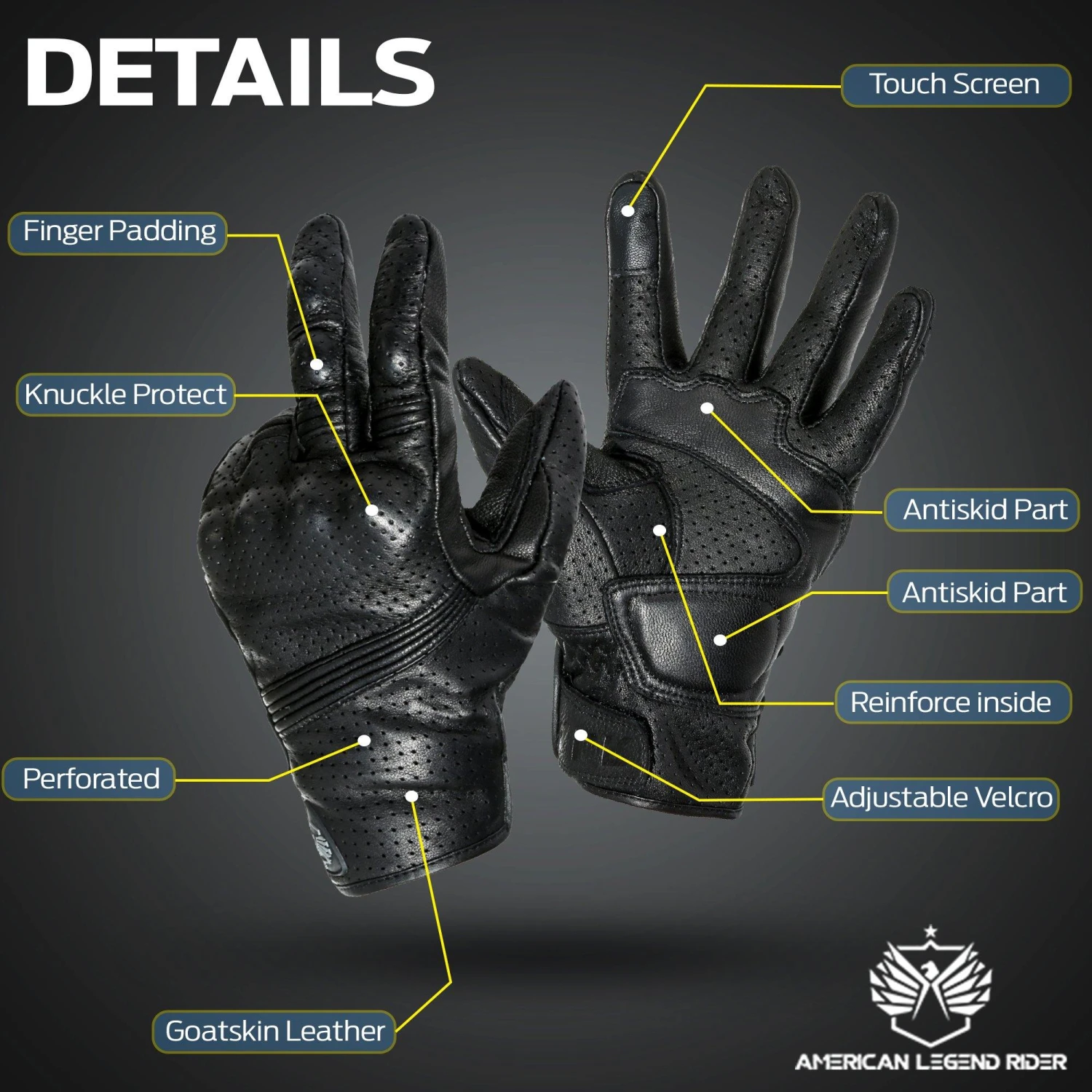 Made from high-quality goatskin leather, these Premium Biker Gloves provide utmost comfort and long-lasting durability. And, because of that, you can wear them on your every day or long-distance rides or any outdoor activities, the material won’t fade or tear for many years. What’s more, they feature an anti-skid backing and reinforced inside part for ultimate protection and comfort. They also have a padded finger that will keep your grip firm and secure, which will help reduce numbness and hand fatigue caused by the vibrations and harden knuckles will add extra protection in case of a fall or accident. Our Premium Biker Gloves are also perforated, allowing airflow circulation and breathability so your hands won’t get sweaty. The adjustable Velcro tape closure provides a more customized and snug fit.