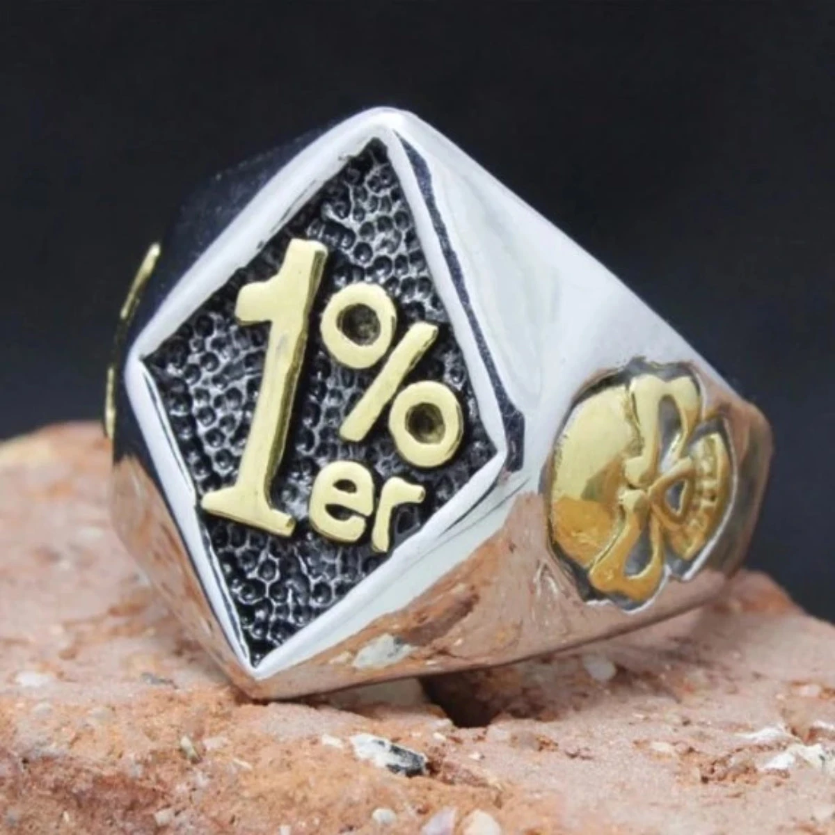 - Design: a diamond-shaped head with the ‘1%ER’ inscribed, contrasting black and gold with two gold skulls engraved on each side
