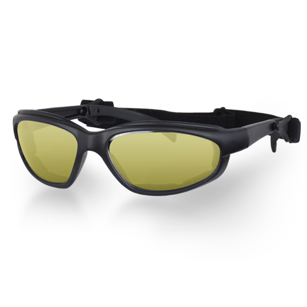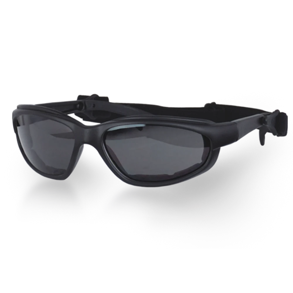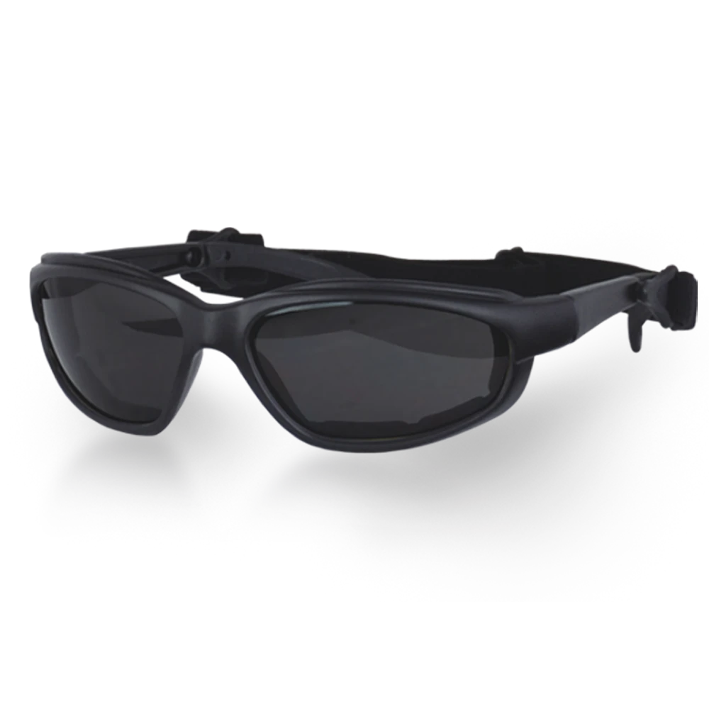 Our Superbiker Goggle in clear, comes with sunglass arms and optional goggle strap. It has UV, anti-Fog shatterproof lenses and a foam ventilated liner eliminating condensation.