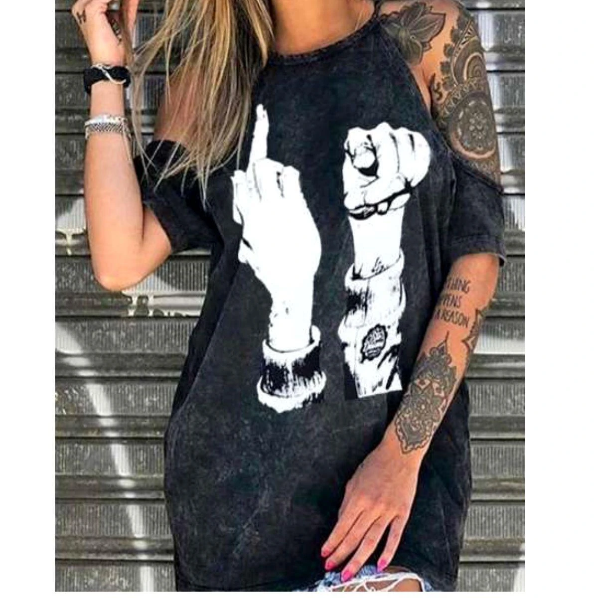 A casual, edgy and cool top with rose and skull graphic. A soft mineral wash makes every individual piece unique and worn. The sleeves also makes an alluring, sexy quality.